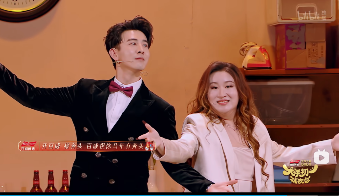 在這樣的場(chǎng)域里出現(xiàn),品牌變成了“氛圍組”的一員。比如,百威連續(xù)合作了今年B站的跨年晚會(huì)、大年初一聯(lián)歡會(huì),沒(méi)有空喊口號(hào),而是深度嵌入了狂歡的氛圍里。