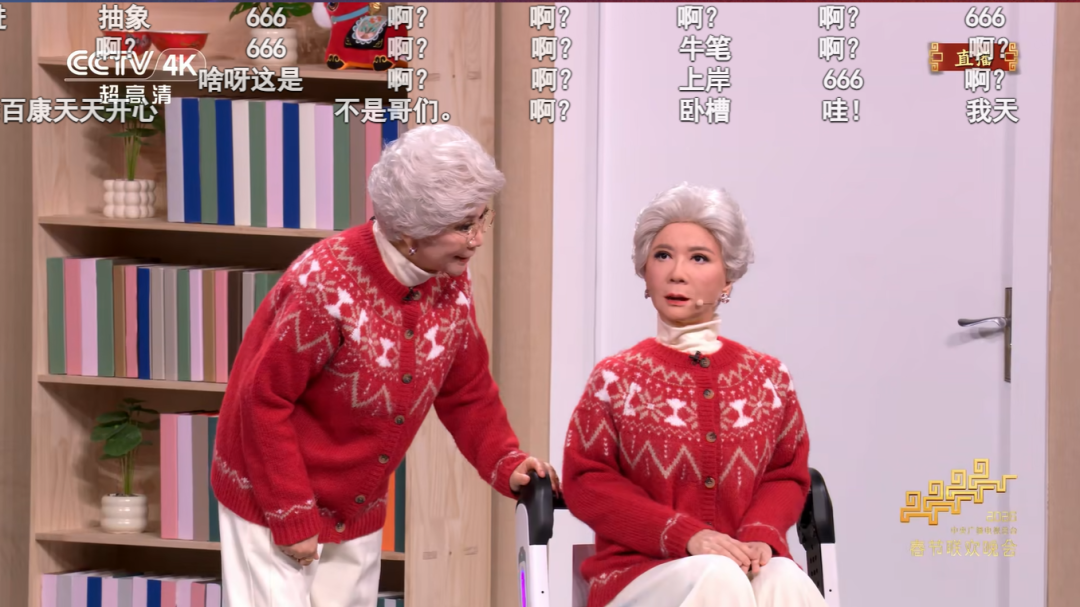 舉個(gè)例子,在今年春晚蔡明、王天放表演的節(jié)目《奶奶的最?lèi)?ài)》中,彈幕“啊?”高強(qiáng)度出現(xiàn),尤其是在最后機(jī)器人分身亮相時(shí),彈幕區(qū)整齊劃一的 “。俊 直接把氛圍感拉滿(mǎn);