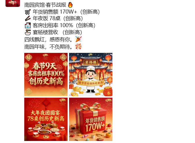 蘇州是新一線城市,其中南園賓館是蘇州城區(qū)唯一的園林別墅式國賓館。今年新春,各類數(shù)據(jù)創(chuàng)造新高,年貨銷售額170W+,年夜飯78桌,客房出租率100%……
