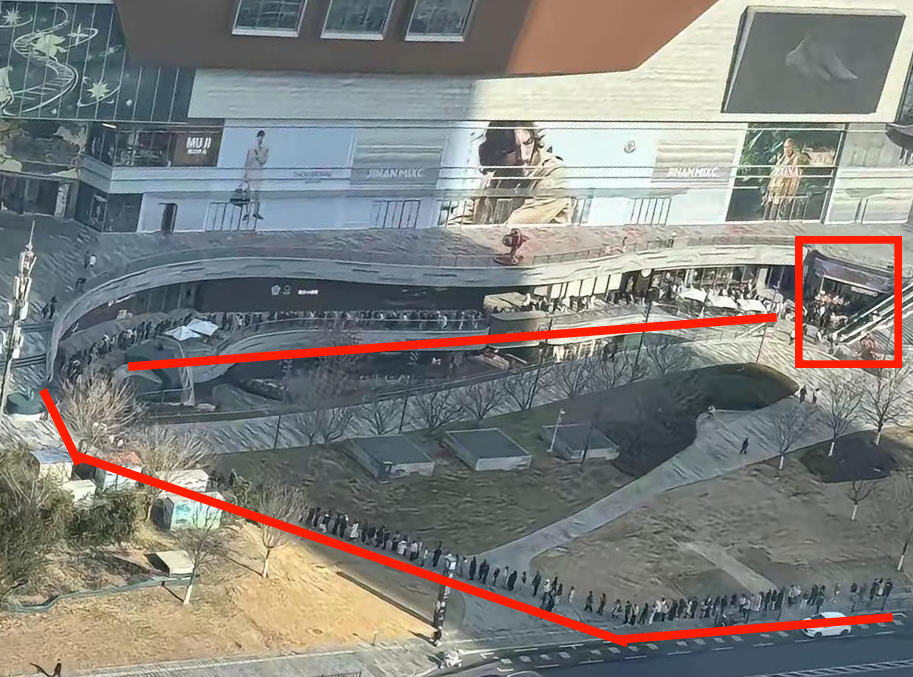 方框中為壽司郎店面,排隊(duì)排到了馬路上 圖源:小紅書