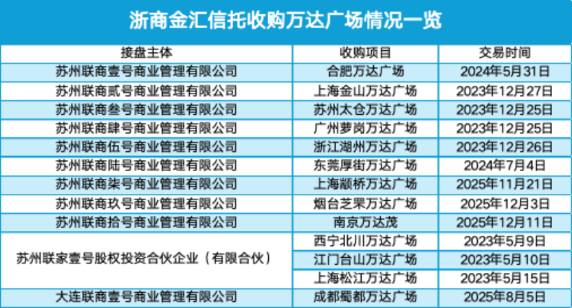 自2023年開始,浙商金匯信托便透過旗下的“蘇州聯(lián)商”系列公司,頻繁出現(xiàn)在萬達(dá)的資產(chǎn)交割簿上,截至目前,其名下持有的萬達(dá)廣場數(shù)量達(dá)到13座。