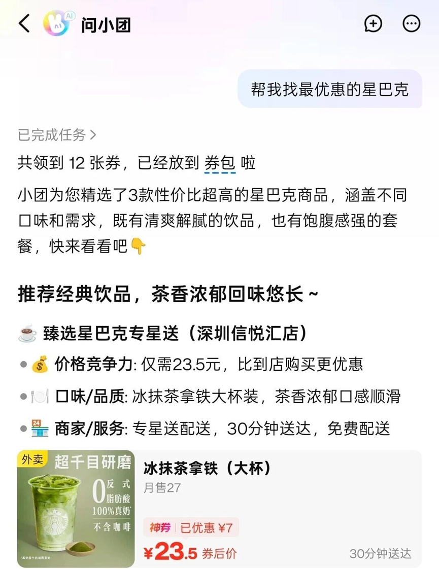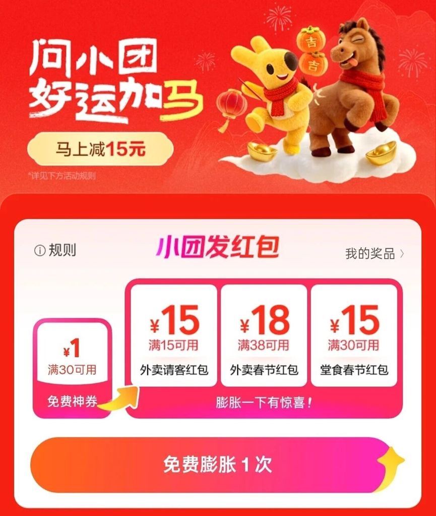 到了春節(jié)期間,美團(tuán)又發(fā)力AI,加入春節(jié)AI大戰(zhàn)。具體而言,美團(tuán)推出發(fā)紅包活動,用戶在美團(tuán)APP搜索框使用“問小團(tuán)”AI功能并參與活動,可以領(lǐng)取平臺提供的優(yōu)惠券。該AI功能內(nèi)嵌于美團(tuán)APP中,可以回答用戶有關(guān)吃喝玩樂的種種問題、幫用戶查詢優(yōu)惠、自動領(lǐng)券等。