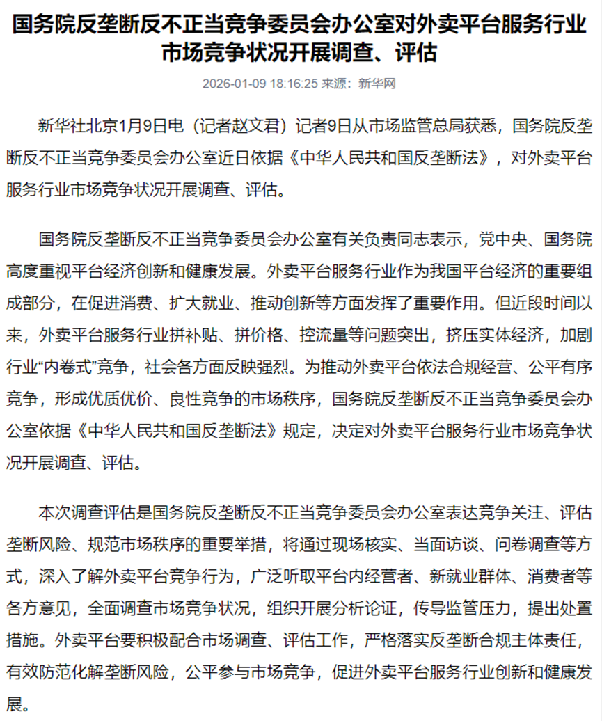 今年1月初,國務(wù)院反壟斷反不正當(dāng)競爭委員會辦公室依法對外賣平臺服務(wù)行業(yè)市場競爭狀況開展調(diào)查、評估。官方表示:“近段時間以來,外賣平臺服務(wù)行業(yè)拼補(bǔ)貼、拼價格、控流量等問題突出,擠壓實體經(jīng)濟(jì),加劇行業(yè)‘內(nèi)卷式’競爭,社會各方面反映強(qiáng)烈!薄巴赓u平臺要公平參與市場競爭,促進(jìn)外賣平臺服務(wù)行業(yè)創(chuàng)新和健康發(fā)展。”
