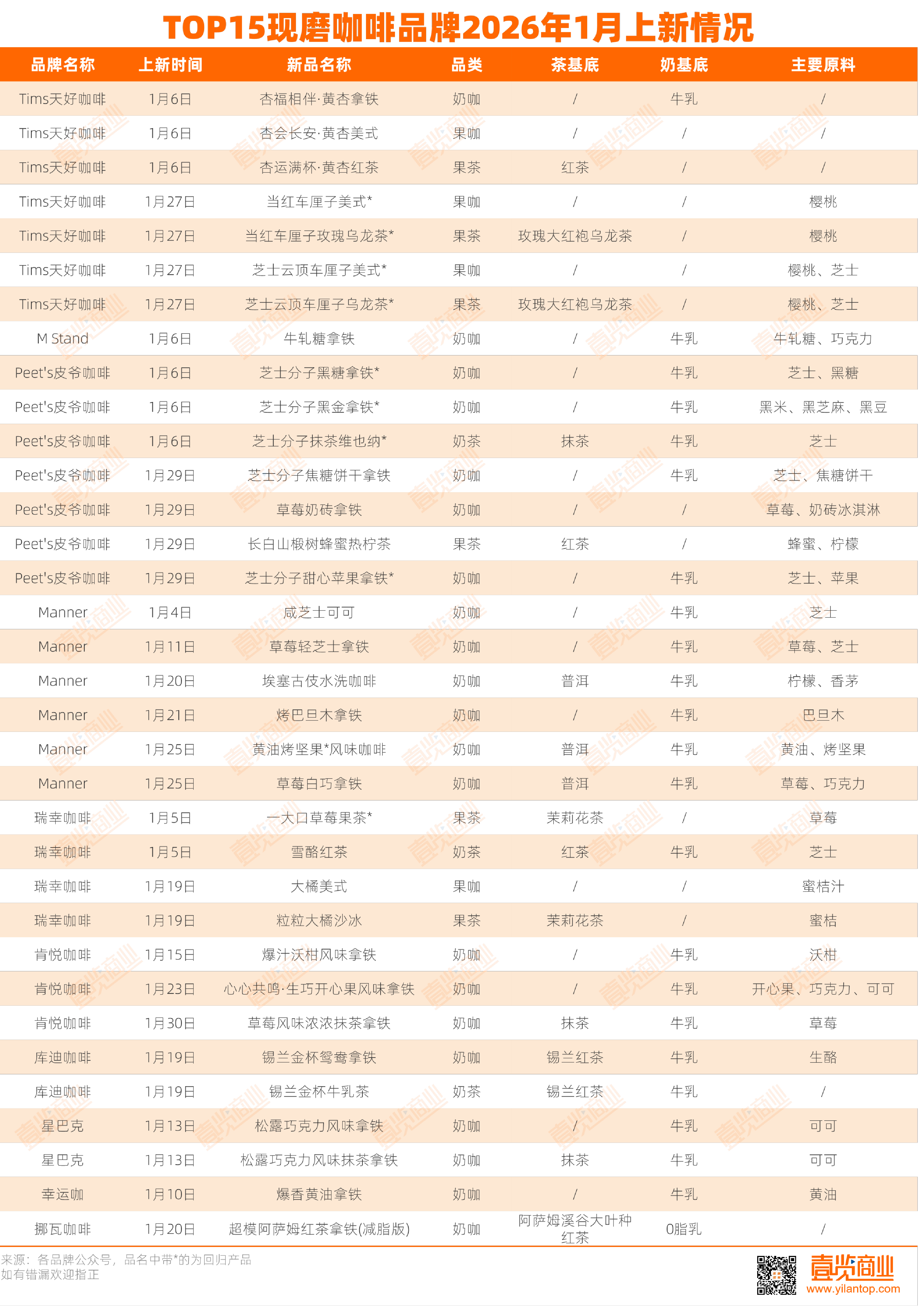 壹覽商業(yè)數(shù)據(jù)顯示,2026年1月,全國門店數(shù)量排名前十五的茶咖品牌合計推出94款新品。其中,現(xiàn)制茶飲品牌共上新60款產(chǎn)品,包含6款回歸產(chǎn)品;現(xiàn)磨咖啡品牌上新34款產(chǎn)品,包含9款回歸產(chǎn)品。