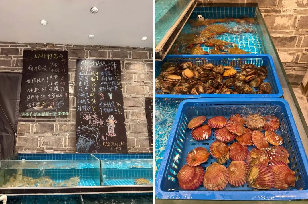 舊村,成立于2019年,人均100元,強(qiáng)化“東海漁村”印象,以上海為主陣地,布局全國門店大約8家。舊村在空間設(shè)計(jì)上更偏樸素和生活感,店里大量使用青磚、藤編等自然材料,菜單是手寫黑板式。