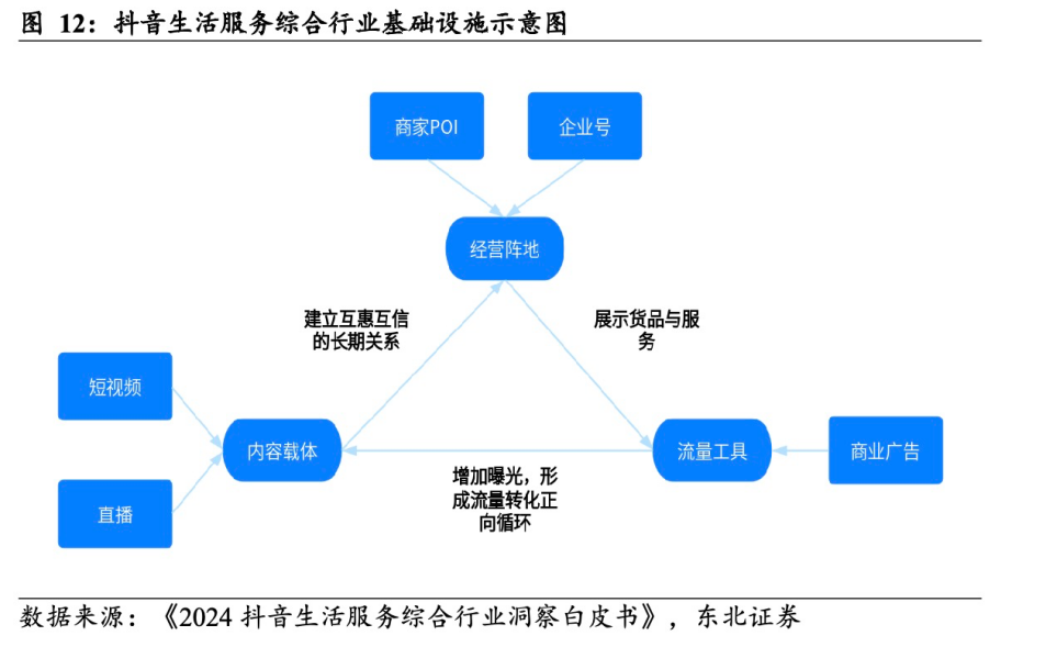 東北證券指出,商家以企業(yè)號為線上經(jīng)營身份的核心,以POI(線下門店)為線上線下的連接樞紐,在抖音上搭建穩(wěn)定的經(jīng)營陣地。圍繞這一陣地,品牌通過短視頻和直播兩大內(nèi)容載體持續(xù)輸出產(chǎn)品信息和場景化故事,再配合流量工具和商業(yè)廣告進行曝光加速,形成“內(nèi)容—流量—轉(zhuǎn)化”的閉環(huán),實現(xiàn)生意增長。