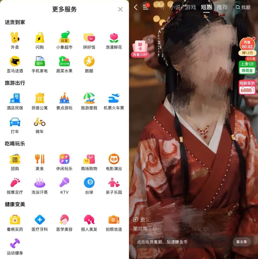 圖:美團(tuán)App業(yè)務(wù)展示及短劇推薦頁(yè)面 來(lái)源:美團(tuán)App 《聽筒Tech》截圖