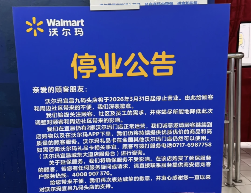 聯商快訊:近日,沃爾瑪官方發(fā)布公告,宜昌九碼頭店將于3月31日起停止營業(yè)。