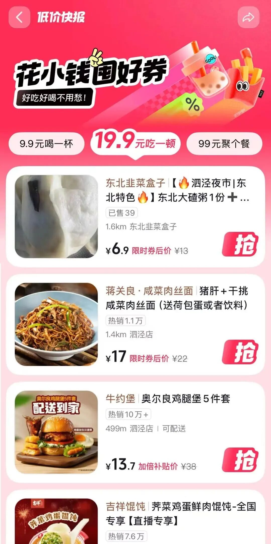 打開App,只有簡(jiǎn)單粗暴的“9.9喝一杯”“19.9吃一頓”和周邊的一些美食列表。非常簡(jiǎn)潔,效率很高。