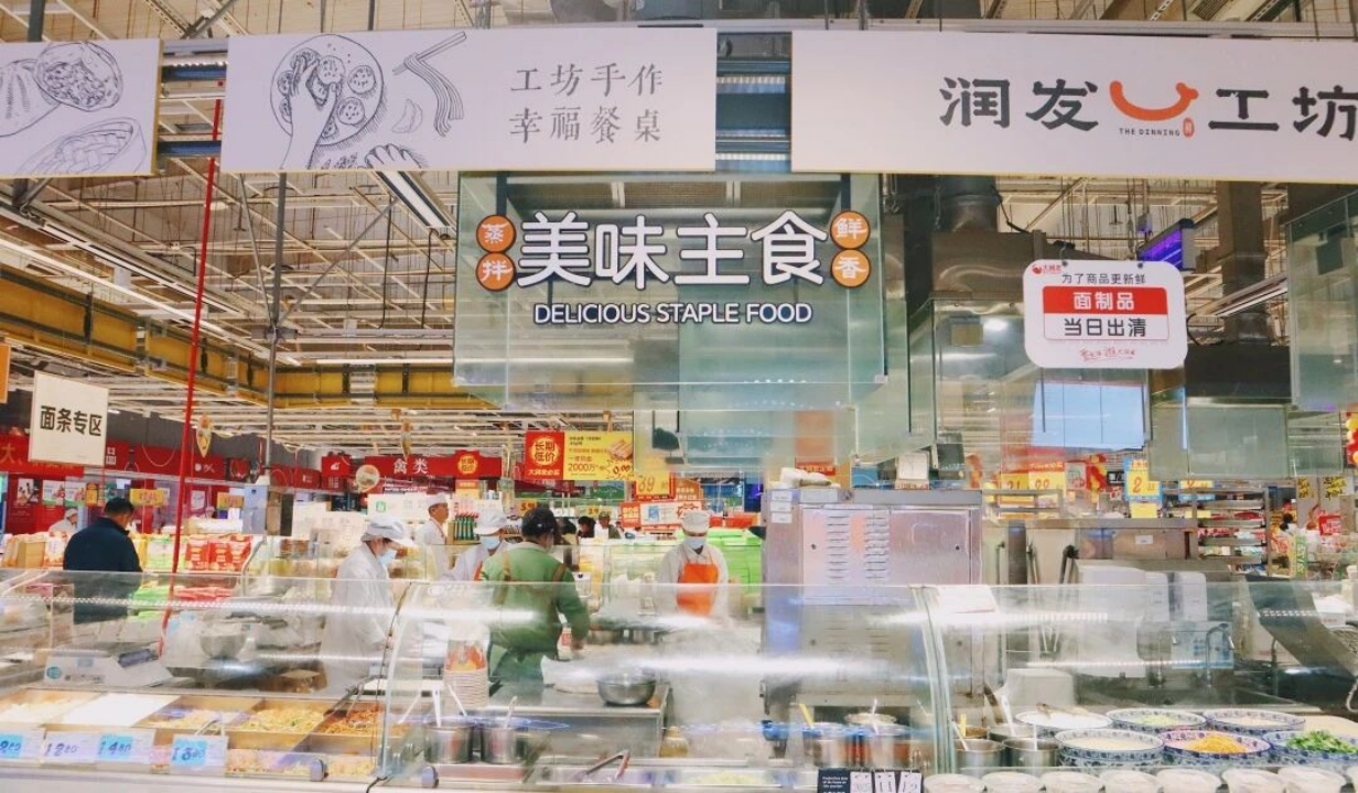 空間動線上,打破傳統(tǒng)強制動線,縮短貨架、降低高度、拓寬主通道,將熟食、烘焙等現(xiàn)制檔口前置,用煙火氣吸引客流。比如揚州邗江店打通鮮食業(yè)態(tài),形成一站式體驗帶;昆山花橋店前置水產(chǎn)加工區(qū),強化現(xiàn)制場景;上海張江店優(yōu)化通道布局,提升購物效率。