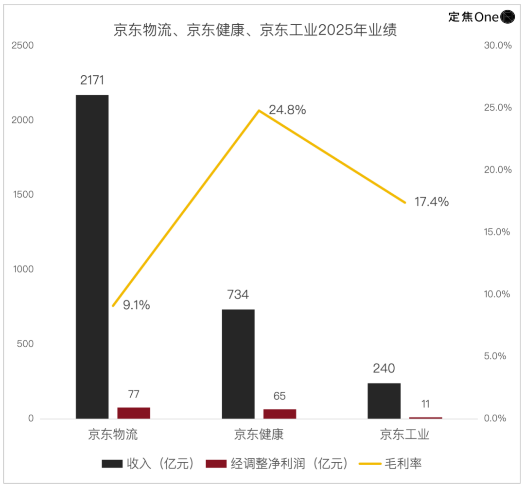 與前兩者不同,2025年底剛上市的京東工業(yè)是一個純粹的B端產(chǎn)業(yè)故事。它的2025年收入(240億)的增速(17.4%)、經(jīng)調(diào)整凈利潤(11.3億)的增速(5.3%),在三家子公司里都是最慢的,經(jīng)調(diào)整凈利潤率從5.3%降至4.7%。