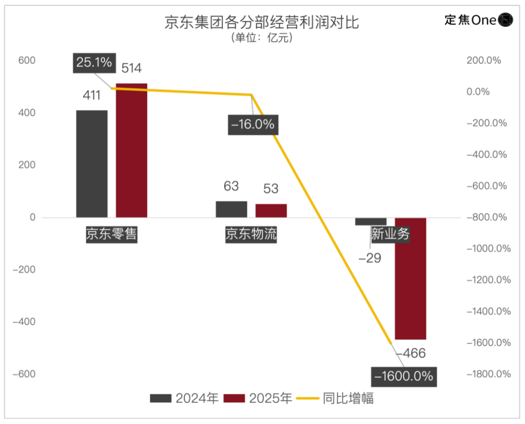 2025年,京東在外賣、社區(qū)團購(京喜)和海外電商等新業(yè)務(wù)上,合計經(jīng)營虧損高達466億元,相比2024年29億的虧損額,擴大了15倍以上。