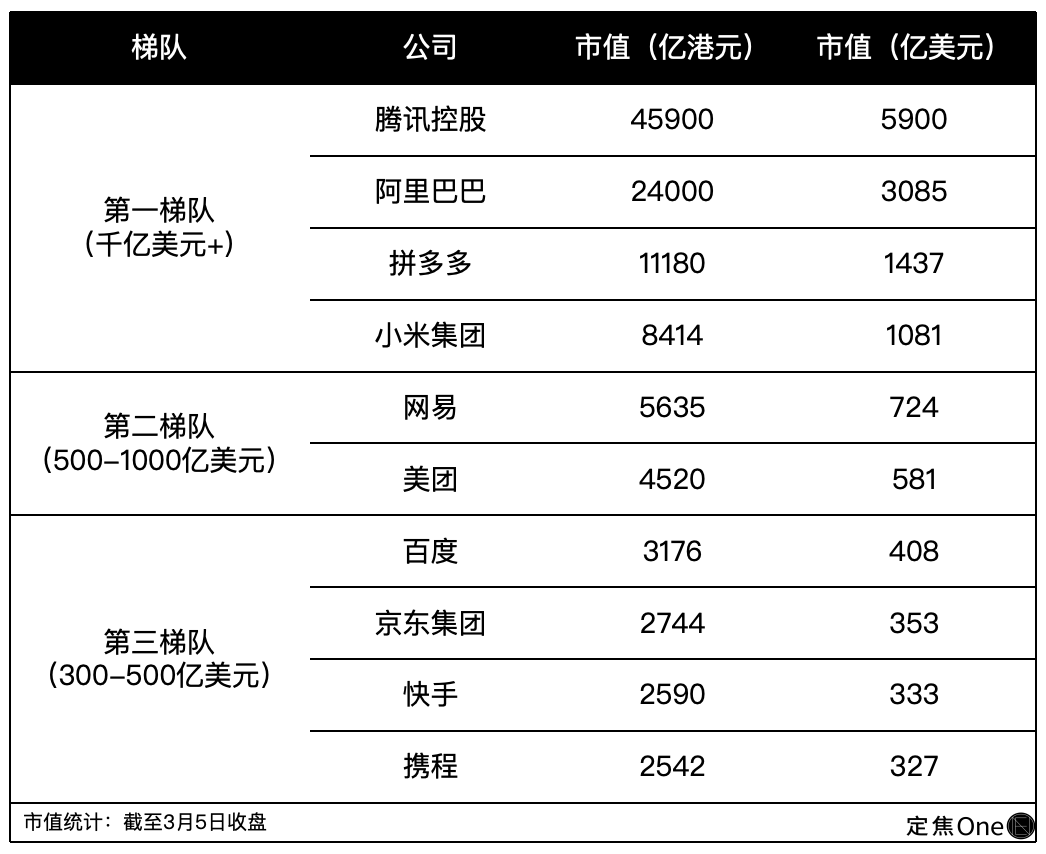 以截至3月5日收盤的市值來看,騰訊、阿里、拼多多、小米屬于第一梯隊,網(wǎng)易、美團位于第二梯隊;京東和百度、快手、攜程同處第三梯隊。