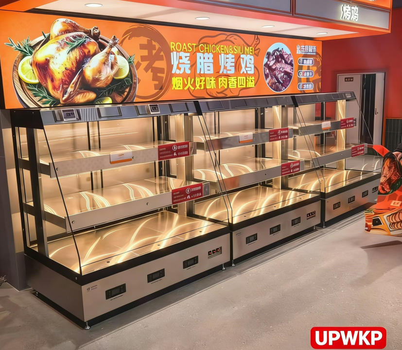 專區(qū)的陳列遵循著“貨賣堆山”的默契,飽滿的擺放自帶吸引力,兩三臺UPWKP立式烤雞熱柜置于專區(qū)中央,暖黃的燈光映襯著雞肉的金黃,香氣順著熱柜的敞開式緩緩散開,老遠(yuǎn)就能勾著過往顧客的腳步。專區(qū)的裝飾不必繁復(fù),幾張產(chǎn)品實拍圖、幾句“現(xiàn)烤現(xiàn)賣”的溫馨提示,便足以勾起食欲,再設(shè)一處小小的試吃臺,讓顧客親口嘗到外酥里嫩的口感,那份UPWKP熱柜提供的直觀的美好,遠(yuǎn)比千言萬語更有說服力。專區(qū)收銀臺旁或啤酒堆旁的一臺小型陳列熱柜,更是點(diǎn)睛之筆,隨手就能帶走的單人份炸雞,總能激發(fā)不經(jīng)意的沖動消費(fèi),讓這份美味觸手可及。