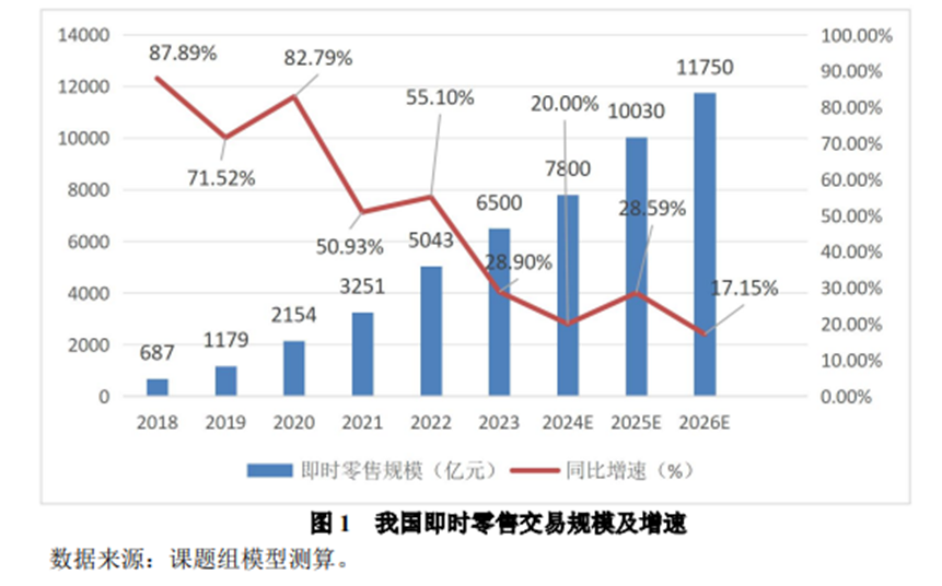 與之形成鮮明對(duì)比的,是即時(shí)零售萬億市場(chǎng)的飛速增長,商務(wù)部國際貿(mào)易經(jīng)濟(jì)合作研究院公布的數(shù)據(jù)顯示,2023年,我國即時(shí)零售規(guī)模達(dá)到6500億元,同比增長28.89%,增速顯著高于電商行業(yè)整體;到了2030年,預(yù)計(jì)即時(shí)零售規(guī)模將達(dá)到驚人的2萬億元。