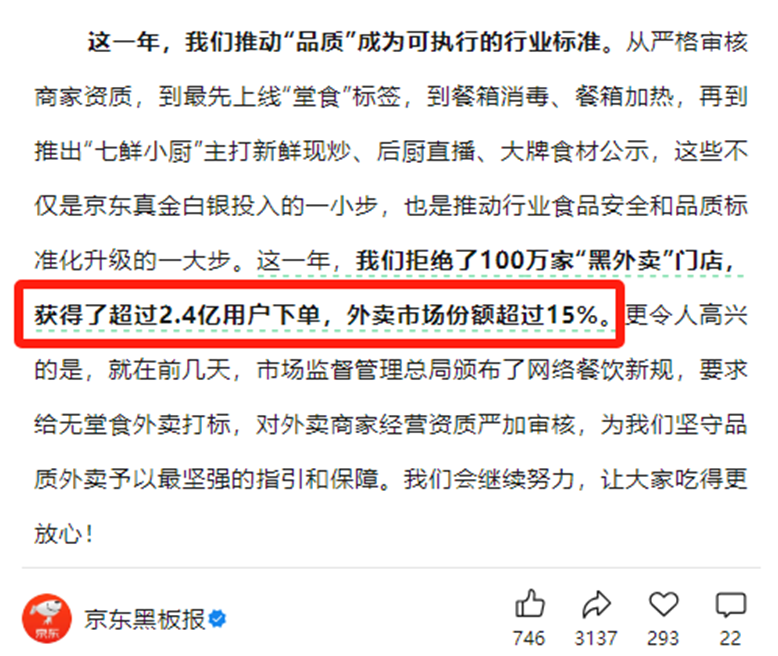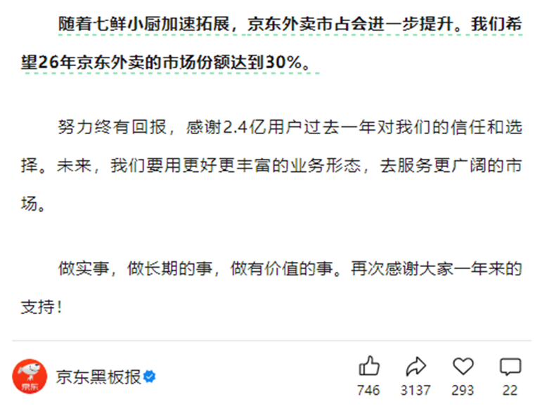或許正因看中這樣的未來可能性,京東選擇油門踩到底,決心把外賣業(yè)務(wù)堅(jiān)持干下去。就在前幾天,京東立下軍令狀,正式宣布:“我們希望26年京東外賣的市場(chǎng)份額達(dá)到30%。”