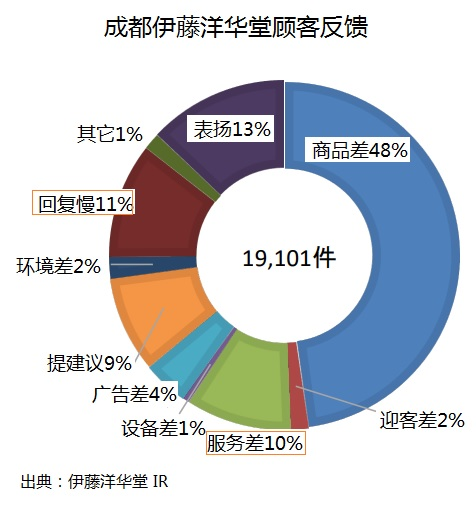 與日本同業(yè)界比較,伊藤洋華堂的商品開發(fā)創(chuàng)新和運營效率相較同行有很大的差距,從中國伊藤洋華堂顧客反饋信息結構看,重點缺陷也是聚焦在商品本身。
