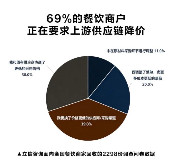 報告透露,補貼大戰(zhàn)下,39%的商戶為求生存,開始更換價格更低廉的原材料供應(yīng)商;30%的商戶強化與現(xiàn)有供應(yīng)商的議價博弈,擠壓上游利潤;20%的商戶選擇增加低成本菜品的占比。