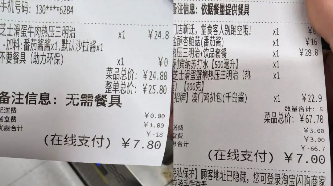肥喵茶餐廳老板在小紅書上發(fā)帖表示:“一份三明治24.8,但是外賣補貼顧客只需在線支付7.8元,甚至一份實付要67.7元的訂單,平臺顧客實付只要7元,外賣大戰(zhàn)受傷的還是實體店,再這樣大家都不來堂食了,外賣比堂食還要便宜”。