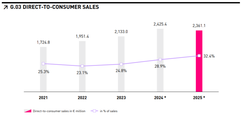 根據(jù)財(cái)報(bào),2025年,在批發(fā)業(yè)務(wù)銷售額下降12.8%至49.35億歐元(約合人民幣390.53億元)的同時(shí);彪馬的電子商務(wù)和實(shí)體零售店均實(shí)現(xiàn)3.4%的增長(zhǎng),推動(dòng)DTC業(yè)務(wù)增長(zhǎng)3.4%至23.61億歐元(約合人民幣186.84億元),DTC業(yè)務(wù)份額增至32.4%。