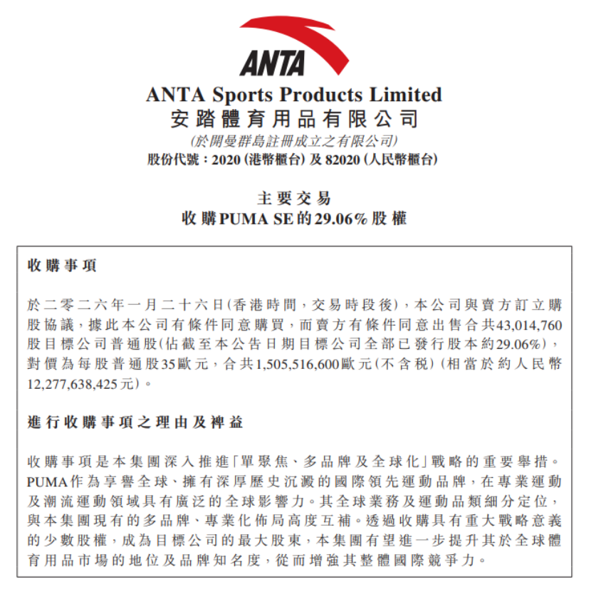 1月27日,安踏集團(tuán)宣布與法國(guó)Pinault家族的投資公司 Groupe Artémis 達(dá)成協(xié)議,收購(gòu)彪馬所屬公司PUMA SE 的29.06%股權(quán),現(xiàn)金對(duì)價(jià)15億歐元(約合122.8億元人民幣),交易預(yù)計(jì)于2026年底前完成。