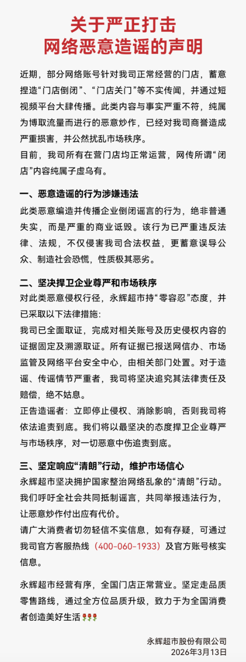 聯(lián)商快訊:3月13日,永輝發(fā)布《關(guān)于嚴(yán)正打擊網(wǎng)絡(luò)惡意造謠的聲明》,目前永輝所有在營(yíng)門(mén)店均正常運(yùn)營(yíng),網(wǎng)傳所謂“閉店”內(nèi)容純屬子虛烏有。