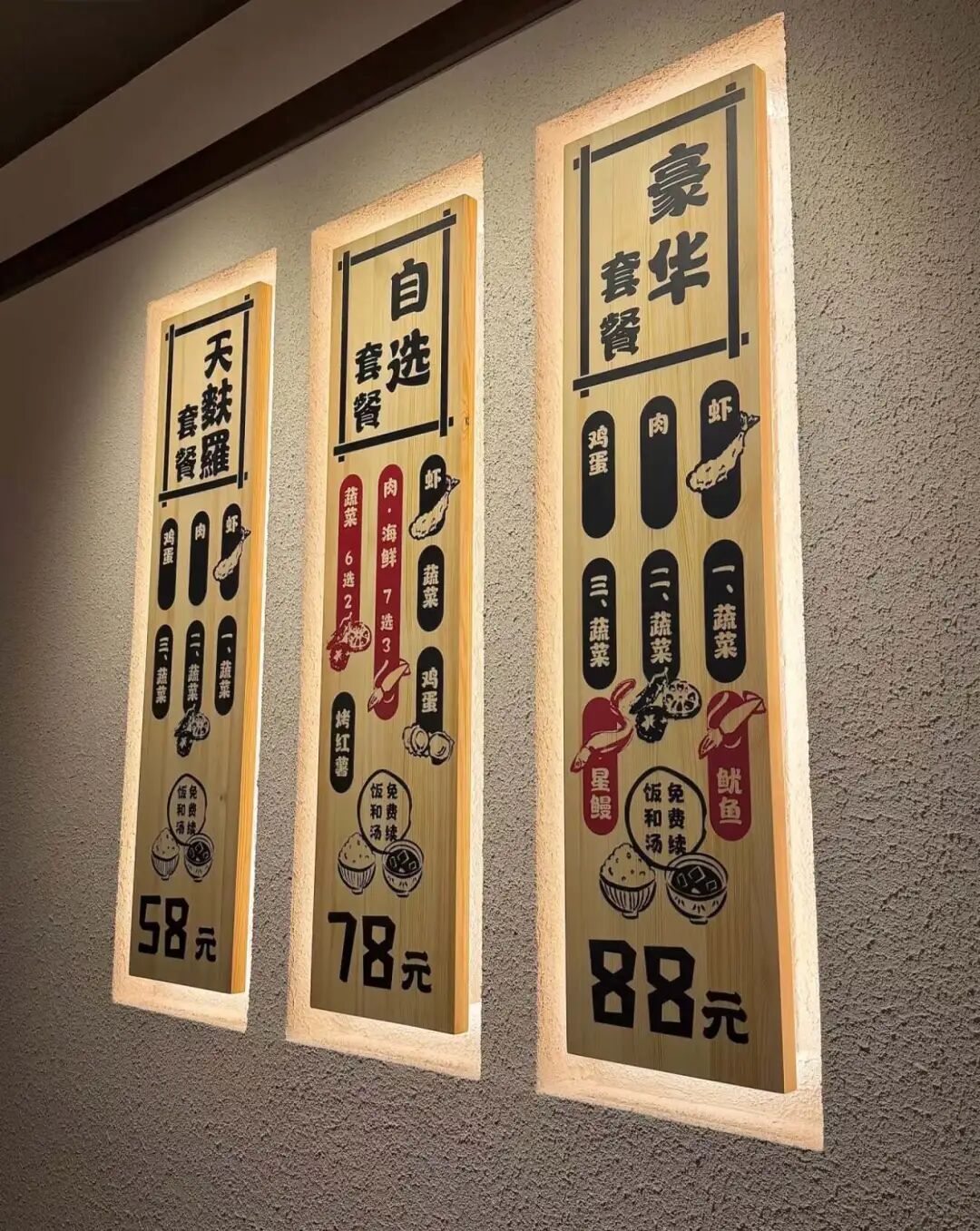 這類門店幾乎全部圍繞天婦羅展開,菜單結(jié)構(gòu)簡單清晰:以幾款固定套餐為主,搭配少量單點(diǎn)。按順序三段上菜,保證顧客吃到嘴里都是熱乎的。米飯和味增湯往往可以無限續(xù)加,讓整體用餐更具性價(jià)比。