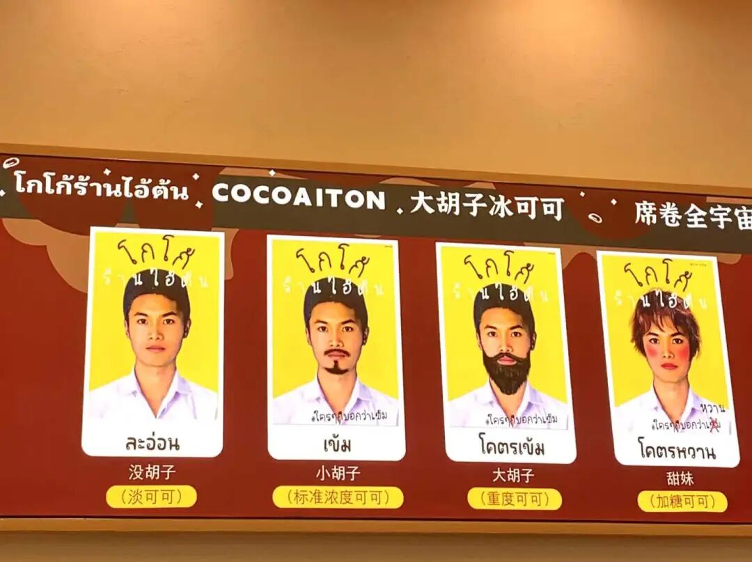 此前的泰式奶茶,其主色調(diào)是“魔性”。最典型的就是大胡子冰可可,以創(chuàng)始人證件照作為品牌logo,消費者可根據(jù)胡子長度選擇可可濃度,品牌也靠超強記憶點迅速走紅。