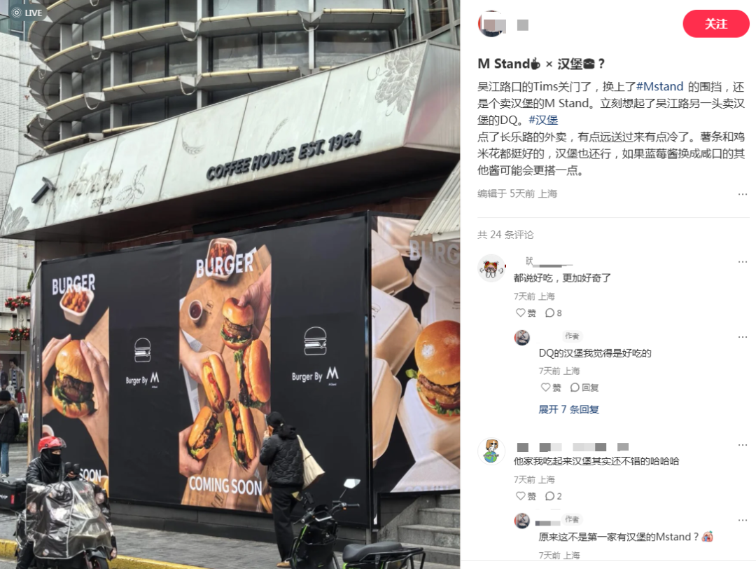 從小紅書網友發(fā)布的圍擋照片來看,目前僅能看到“Burger by M”字樣,尚無法確認三家新店是否會沿用上海Maison概念店的業(yè)態(tài)與空間布局,但從其在多個城市的門店布局也側面表明:M Stand在謀劃漢堡業(yè)務這件事上,是有一定“野心”的。