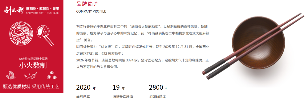 回顧劉文祥麻辣燙的發(fā)展歷程,2005年,劉文祥夫婦在黑龍江佳木斯開出第一家門店,憑借重口湯底、足量麻醬的東北麻辣燙特色,在區(qū)域市場站穩(wěn)腳跟,歷經十余年沉淀,于2017年正式開啟加盟模式。