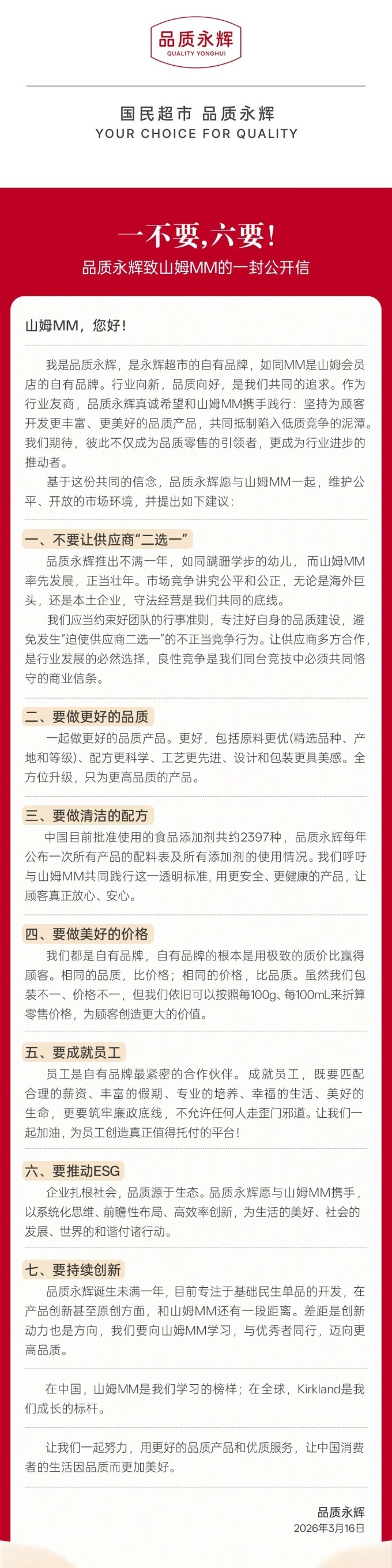 聯(lián)商快訊:3月16日,永輝超市自有品牌品質(zhì)永輝通過(guò)官方公眾號(hào)發(fā)布《致山姆MM的一封公開(kāi)信》,對(duì)標(biāo)山姆會(huì)員店自有品牌山姆MM,向行業(yè)發(fā)出公平競(jìng)爭(zhēng)、品質(zhì)共建的聯(lián)合倡議。
