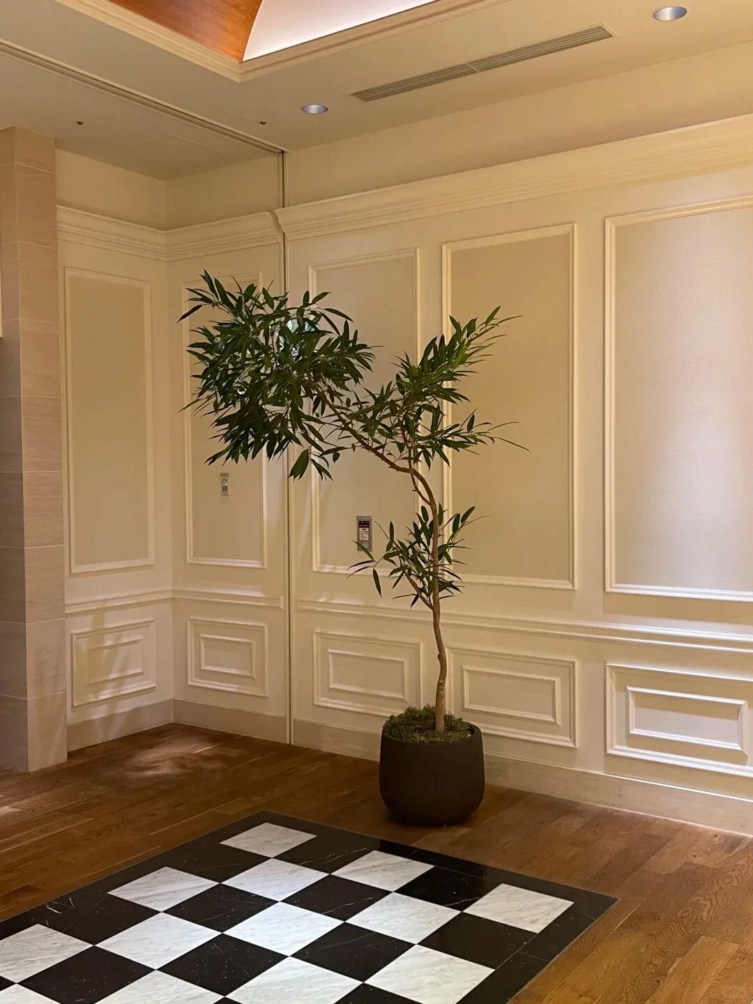 空間整體留白多,視覺上很“寬!保直弧胺諊碧顫M。公共空間用現(xiàn)代風(fēng)格瓷磚和木地板做拼接,法式風(fēng)格對(duì)撞下,處處透著日式嚴(yán)絲合縫的秩序感;燈光也是恰到好處的柔和,低飽和色系的內(nèi)部環(huán)境令人放松。