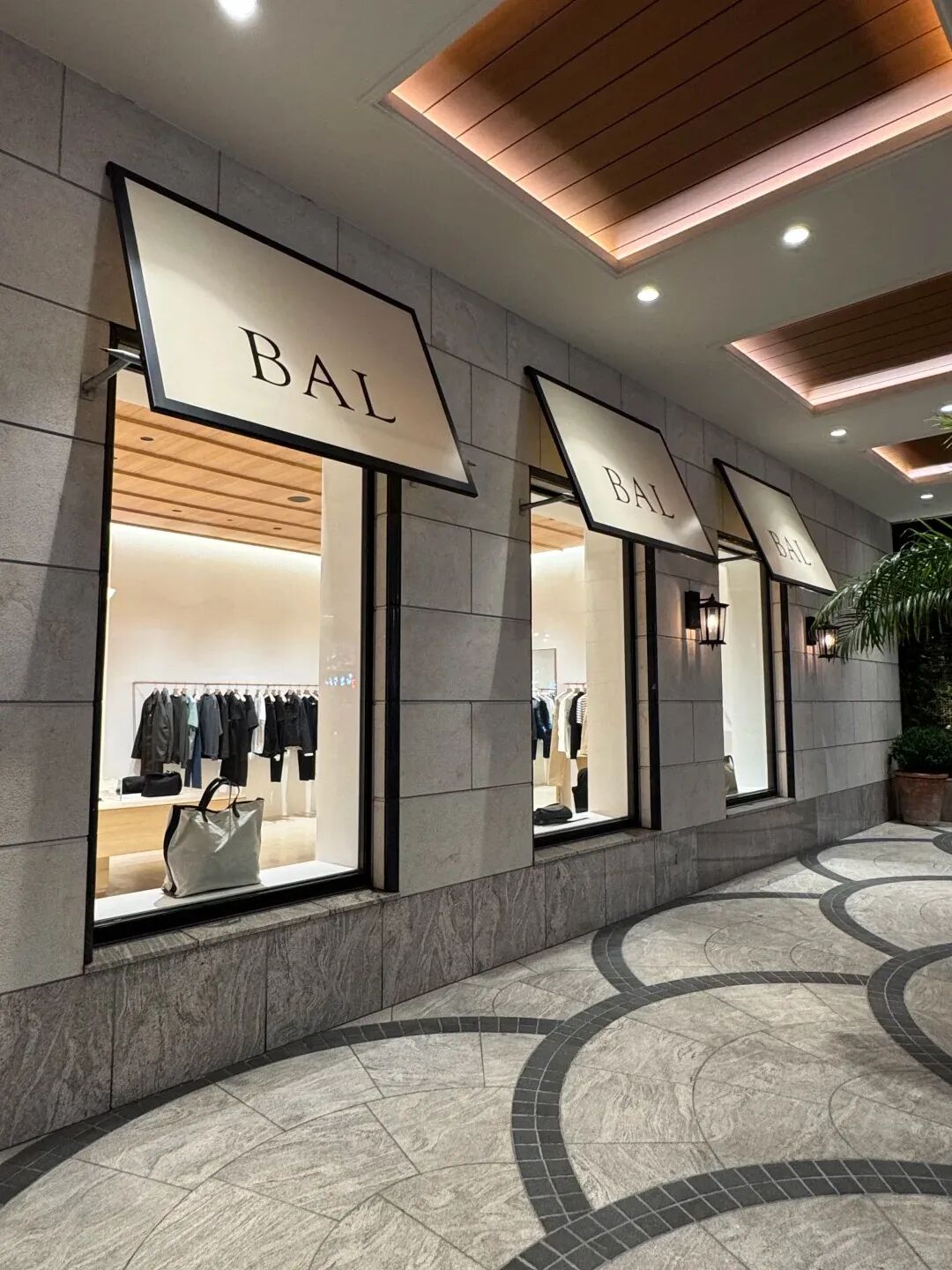 審美上,BAL用法式風(fēng)格拼接日式詫寂,這條美學(xué)主線貫穿商場(chǎng)始終。拱形門、法式遮陽(yáng)棚、弧形吊頂,一眼是濃濃法式風(fēng)情的框架,細(xì)看又埋了日系審美線索:比如門口小磚拼出青海波圖案、過道盡頭獨(dú)放一株綠植、商品展陳用了大量簡(jiǎn)約的原木展架等等。
