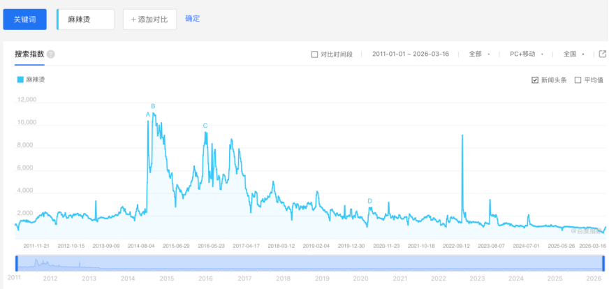 通過百度指數(shù)可以看到,近幾年“麻辣燙”的搜索熱度,顯著低于此前。近15年時(shí)間里,“麻辣燙”的熱度經(jīng)歷了高漲到驟冷,熱度最高時(shí)2014年7月達(dá)到11081,2014年到2018年期間,始終保持著較高熱度。2020年起,“麻辣燙”熱度出現(xiàn)明顯降溫,此后熱度一路下滑,2026年起熱度始終保持在1000以下。