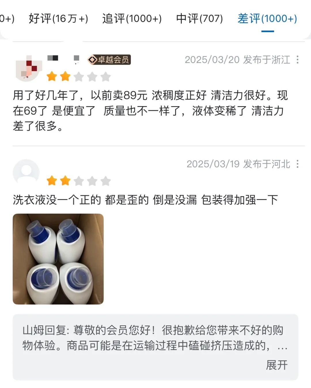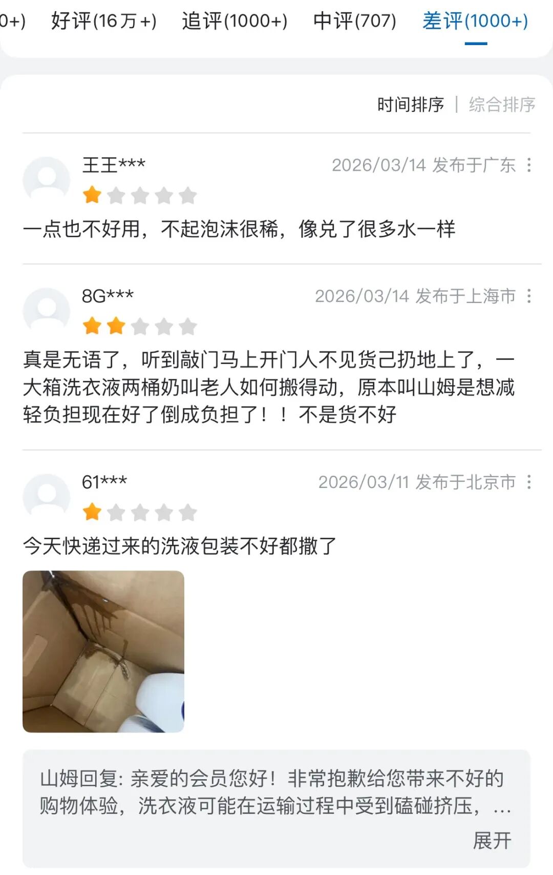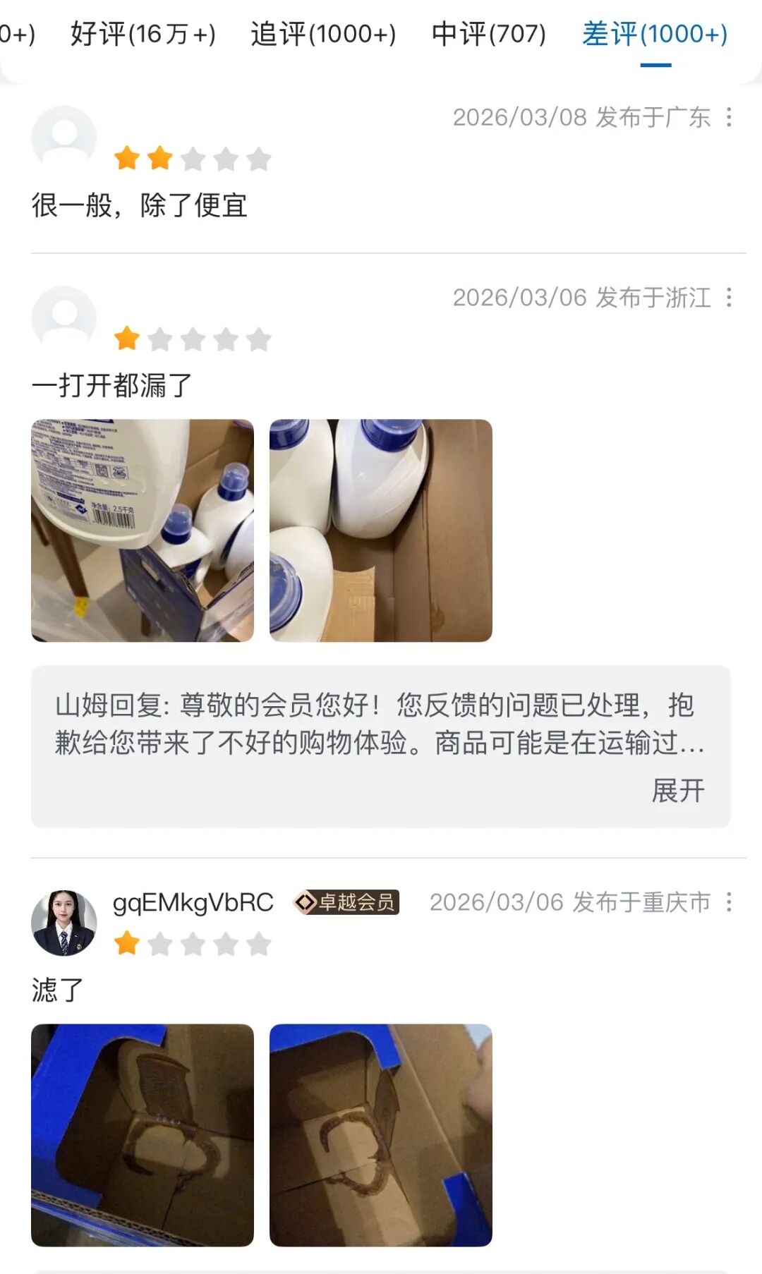 將山姆會員商店(Member‘s Mark)一款熱銷洗衣液在2025年3月與2026年3月的用戶差評進行對比分析,一組數(shù)據(jù)值得關(guān)注:在可統(tǒng)計的差評樣本中,2025年3月有效差評12條,2026年3月有效差評15條,同比增幅達25%。 更值得深思的并非數(shù)量的增長,而是問題結(jié)構(gòu)的“高度復刻”——時隔一年,用戶投訴的核心痛點幾乎未發(fā)生實質(zhì)性改善,部分問題的嚴重程度甚至有所加劇。