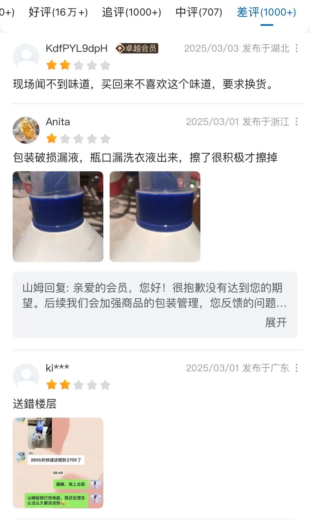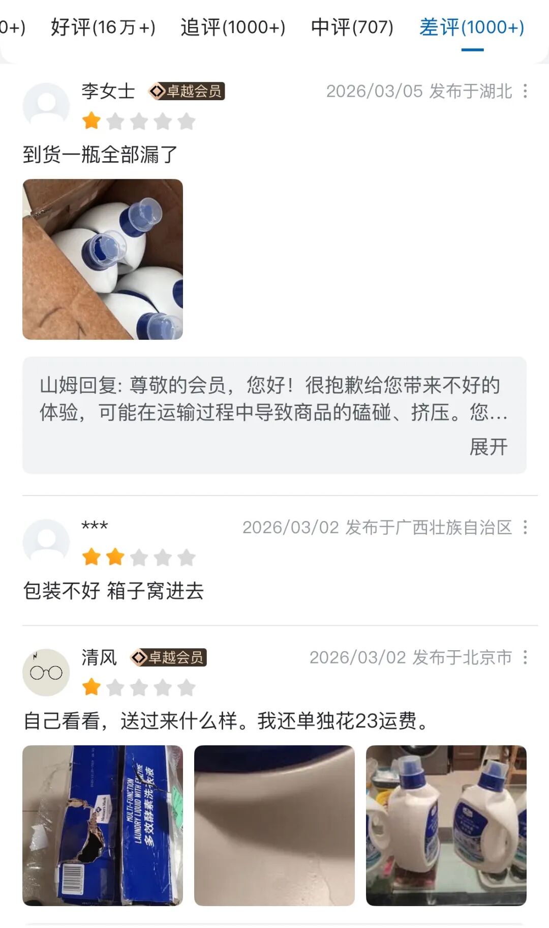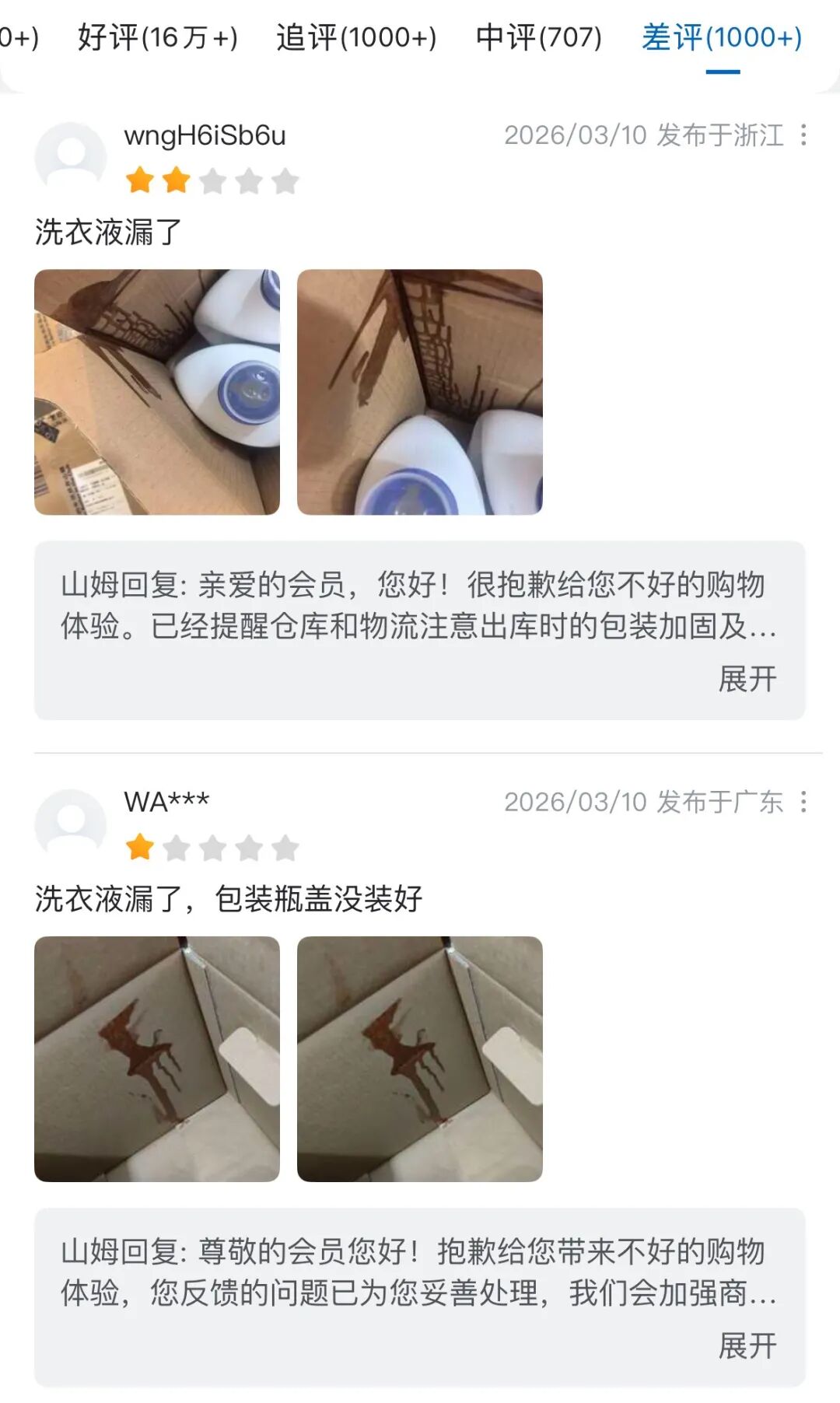 將山姆會員商店(Member‘s Mark)一款熱銷洗衣液在2025年3月與2026年3月的用戶差評進行對比分析,一組數(shù)據(jù)值得關(guān)注:在可統(tǒng)計的差評樣本中,2025年3月有效差評12條,2026年3月有效差評15條,同比增幅達25%。 更值得深思的并非數(shù)量的增長,而是問題結(jié)構(gòu)的“高度復刻”——時隔一年,用戶投訴的核心痛點幾乎未發(fā)生實質(zhì)性改善,部分問題的嚴重程度甚至有所加劇。