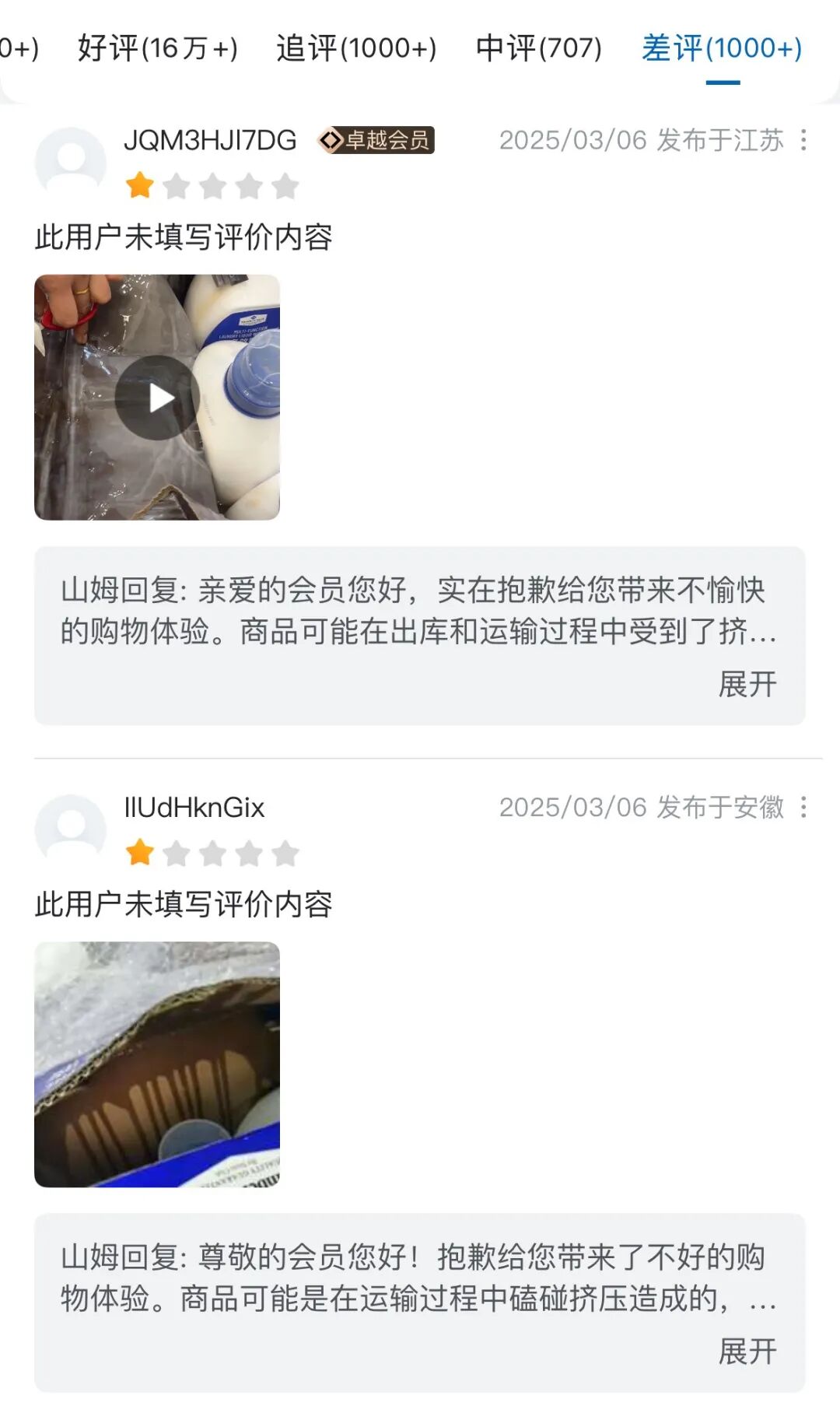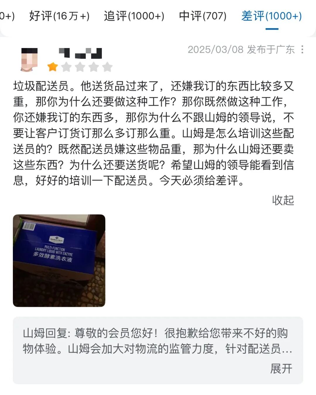作為會員制商超的代表性品牌,山姆的核心價值之一在于其篩選后的服務(wù)體驗。然而,差評中的配送環(huán)節(jié)卻暴露了執(zhí)行層面的顯著落差。