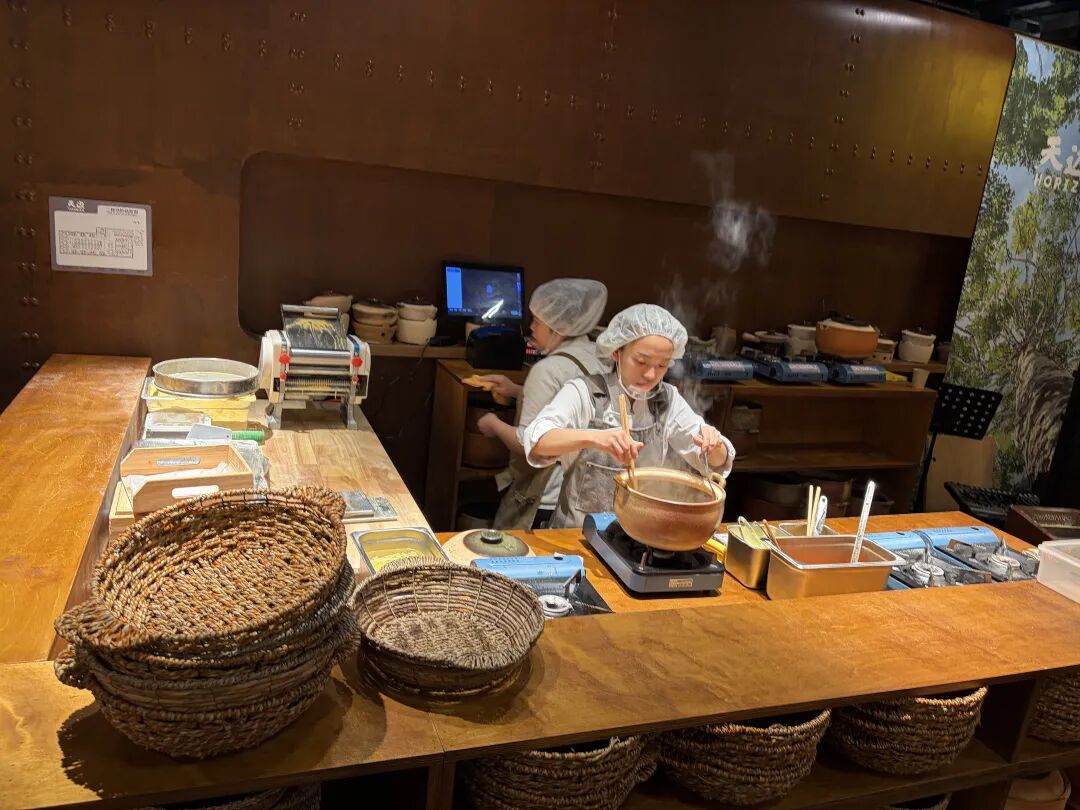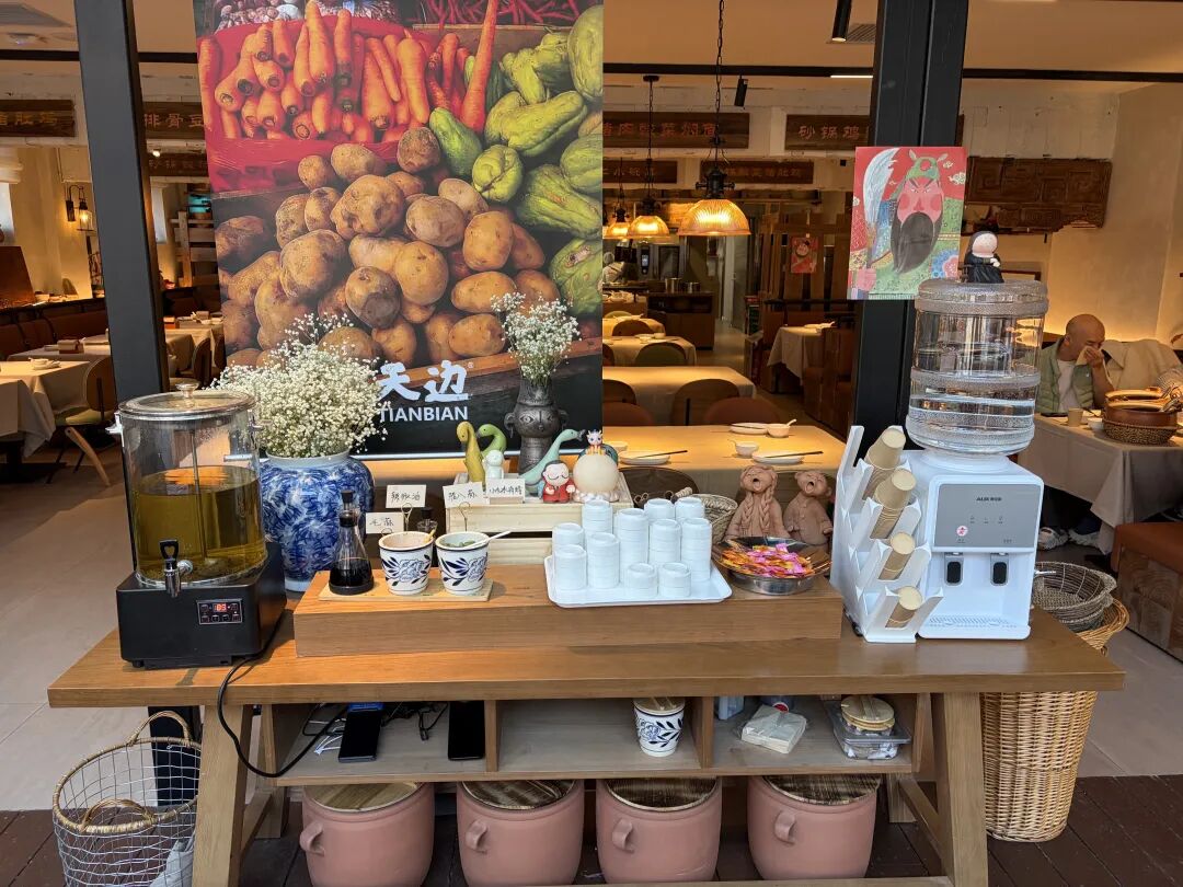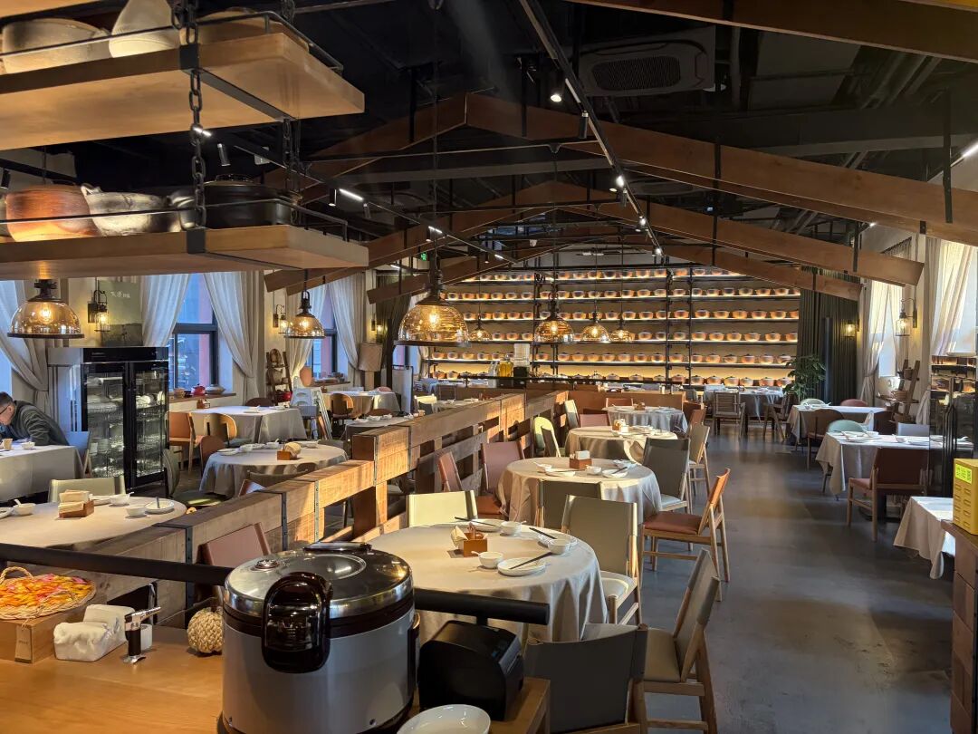 室內(nèi)延續(xù)原生態(tài)風(fēng)格,以木質(zhì)材料為主基調(diào),成排砂鍋與陶罐錯(cuò)落陳列,氛圍粗糲而溫厚。