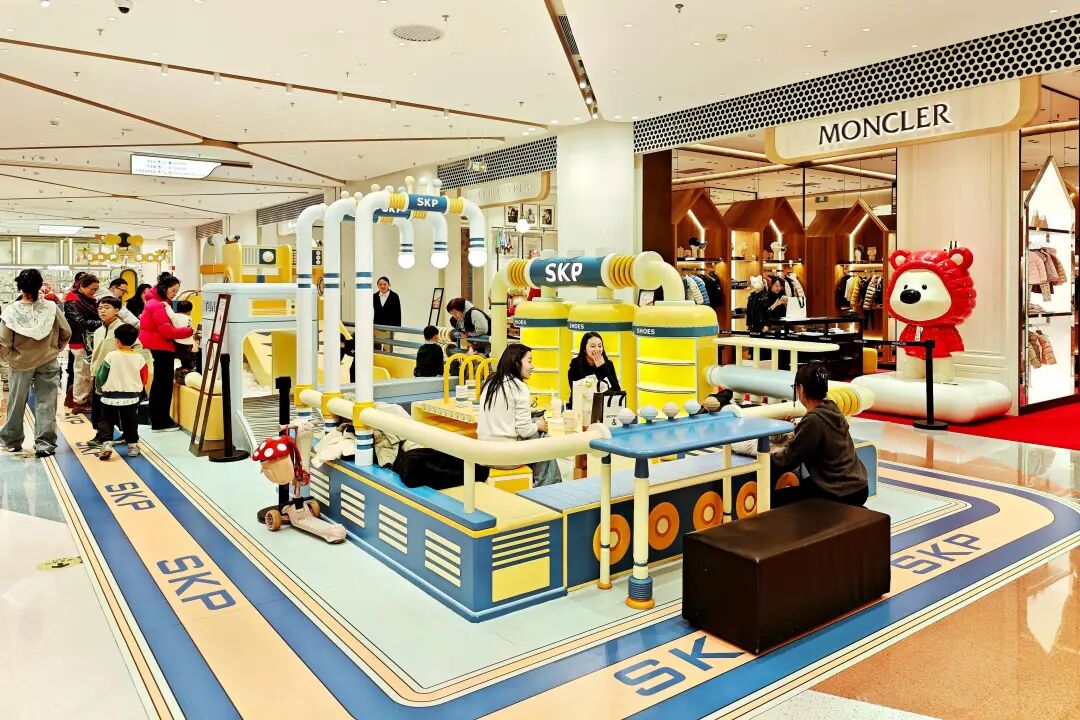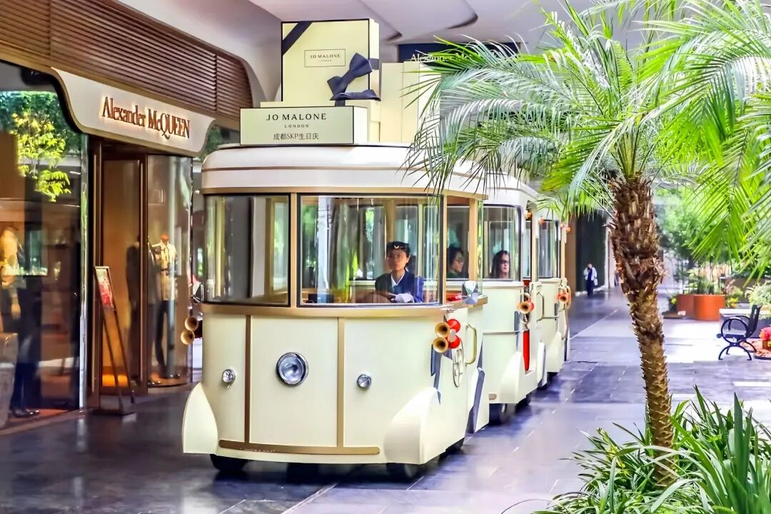 面對意見,成都SKP并未故步自封于「高奢商場不需要休息區(qū)與體驗感」的執(zhí)念,它聽勸地增加大量休息區(qū),強化兒童游樂設(shè)施,并在室內(nèi)外引入四季如春的綠植景觀與花藝裝飾,還帶來SKP項目中首創(chuàng)的擺渡小火車。