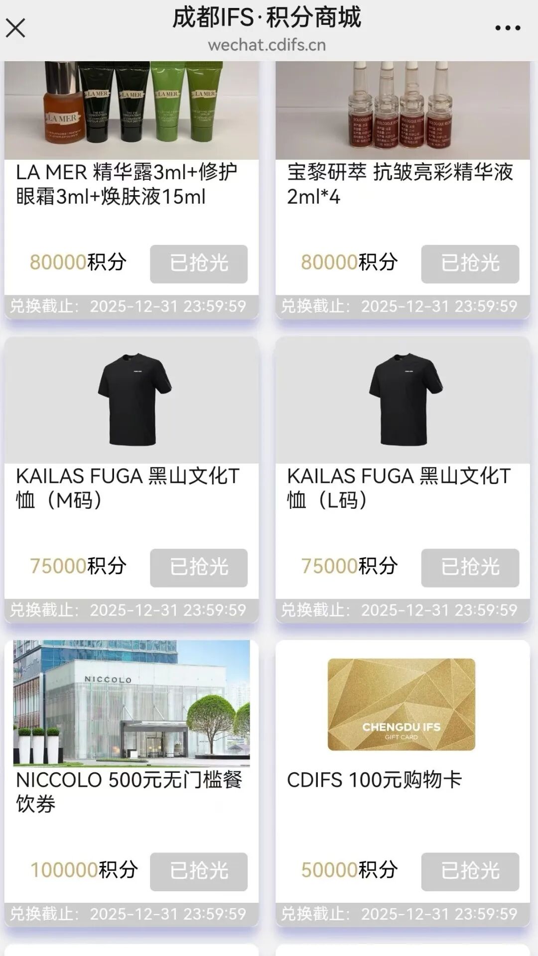 若你是成都IFS會員并消費積累了大量積分,又在年底積分清零之前接到商場通知電話,于是你點進積分商城查看,你大概率會看到除了停車券,絕大多數(shù)可兌換商品標(biāo)注著「已搶光」。