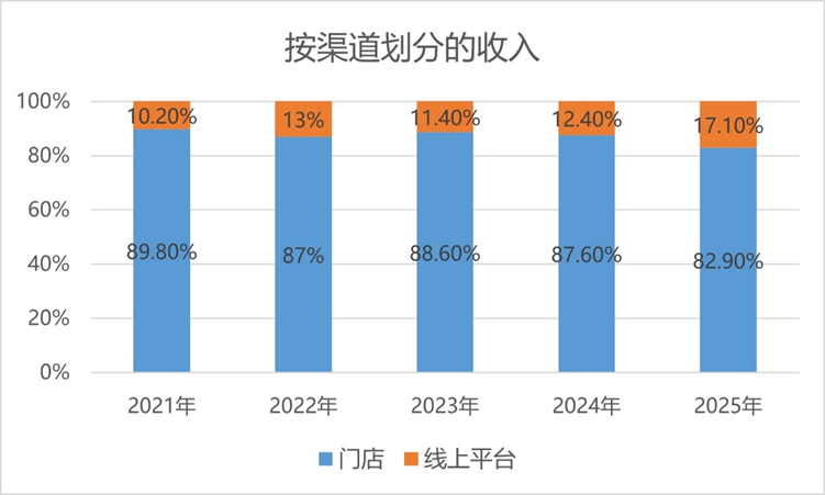 事實(shí)上,老鋪黃金的產(chǎn)品銷售以線下門店渠道為主,但近年來,線上平臺的占比正逐步提高。在2025年,來自門店的收入占老鋪黃金全年收入的82.9%,線上平臺占比17.1%。