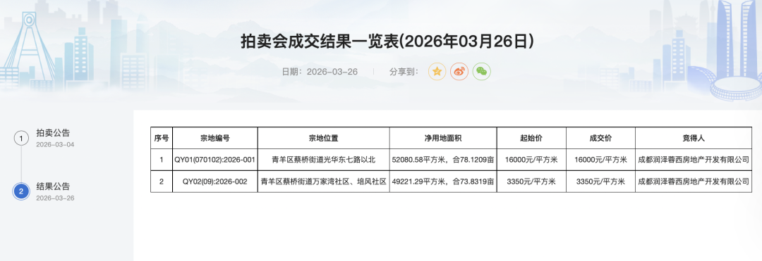 3月26日,成都市公共資源交易服務(wù)中心公布了青羊區(qū)蔡橋街道兩宗地塊的拍賣(mài)成果公告,兩宗地塊為商住組合地塊,凈用地面積約12.1萬(wàn)方,其中商業(yè)用地凈用地面積約4.9萬(wàn)方,均由華潤(rùn)置地旗下子公司成都潤(rùn)澤蓉西房地產(chǎn)開(kāi)發(fā)有限公司摘得。據(jù)悉,該地塊總成交價(jià)為24.79億元。