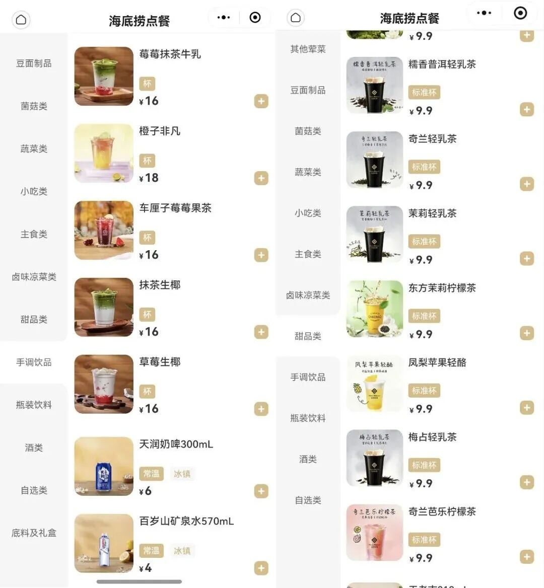 這些在茶飲品牌中動(dòng)輒要十五六元的產(chǎn)品,在海底撈優(yōu)選店以9.9元的價(jià)格出現(xiàn),既降低了消費(fèi)門檻,也拉長了用餐時(shí)段的可能性。