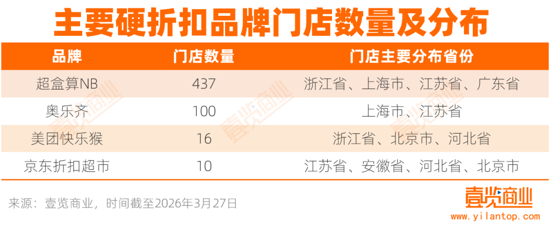 據(jù)壹覽商業(yè)不完全統(tǒng)計,截至2026年3月27日,奧樂齊在全國設(shè)有100家門店,超盒算NB共有437家門店,京東折扣超市有10家門店。