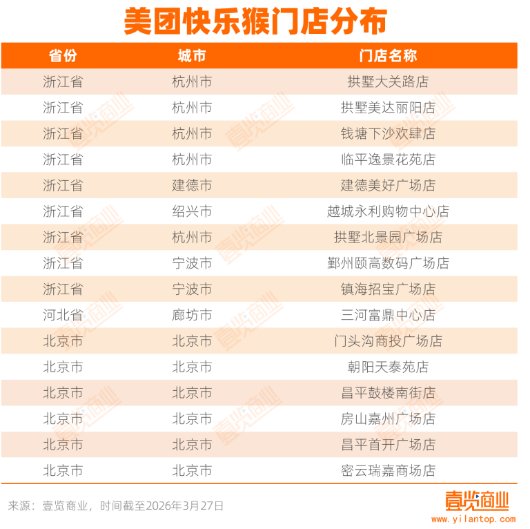3月27日,美團快樂猴一日之內(nèi)連開三店,分別位于浙江省寧波市的鄞州頤高數(shù)碼廣場、寧波市鎮(zhèn)海招寶廣場,以及北京市密云瑞嘉商場,這也意味著美團快樂猴正式進入寧波市場。