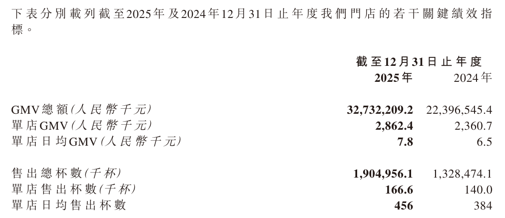 從數(shù)據(jù)層面來看,古茗2025年總GMV漲至327.3億元,同比增長(zhǎng)46.1%,單店GMV同比增20.6%至286萬(wàn)元,單店日均同比增長(zhǎng)21.3%,為7800元。