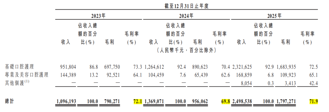 2023年至2025年,小闊科技的毛利率分別為72.1%、69.8%和71.9%。招股書稱,其主要牙膏產(chǎn)品建議零售價(jià)在9.9元至49.9元之間,而牙膏所在的基礎(chǔ)口腔護(hù)理板塊毛利率也明顯領(lǐng)先,同期為73.1%、70.4%、72.5%。