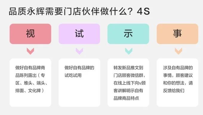 第三是示,門店端的同事,每個(gè)門店都有顧客群,要轉(zhuǎn)發(fā)新品的推文到門店顧客群的微信里面,線上線下向顧客講解明示自有品牌商品的創(chuàng)新特點(diǎn)。