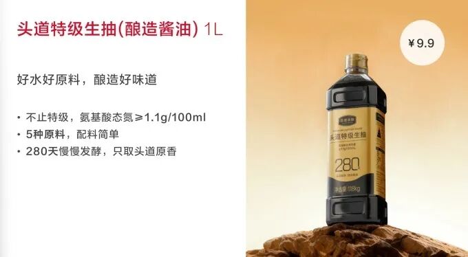 比方說(shuō),這款醬油是千禾幫我們做的,大家知道特級(jí)醬油是0.9%氨基酸態(tài)氮含量,但我們做到了1.1%。另外,280天的釀造周期,市場(chǎng)上一般在120天、160天、180天,我們是280天。第三個(gè)是配料表,醬油里面只有水、鹽、糖、非轉(zhuǎn)基因大豆、小麥,沒(méi)有任何添加劑。這樣的品9塊9/升,在品質(zhì)上面做的非常棒,三個(gè)點(diǎn)就是非常核心的UVP(獨(dú)特的價(jià)值主張),這個(gè)獨(dú)特性要對(duì)顧客帶來(lái)價(jià)值。