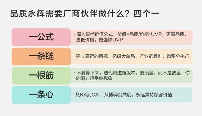 一公式,我們一定要深入一起堅(jiān)持價(jià)值公式,以更高的品質(zhì)、更低的價(jià)格、更強(qiáng)悍的UVP去贏得顧客的信賴。